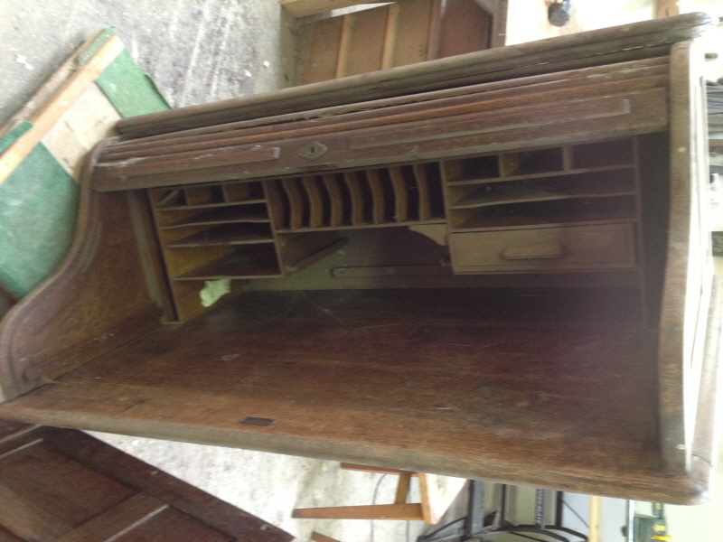 This was a big job. The whole desk and all its drawers needed to be dismantled and re-glued, which I didn’t show in the photos. The tambour door also needed to be re-glued in a press and then the missing components were replaced. I stripped of the old stained finish, to expose its natural colour; then I applied several coats of oil to finish.