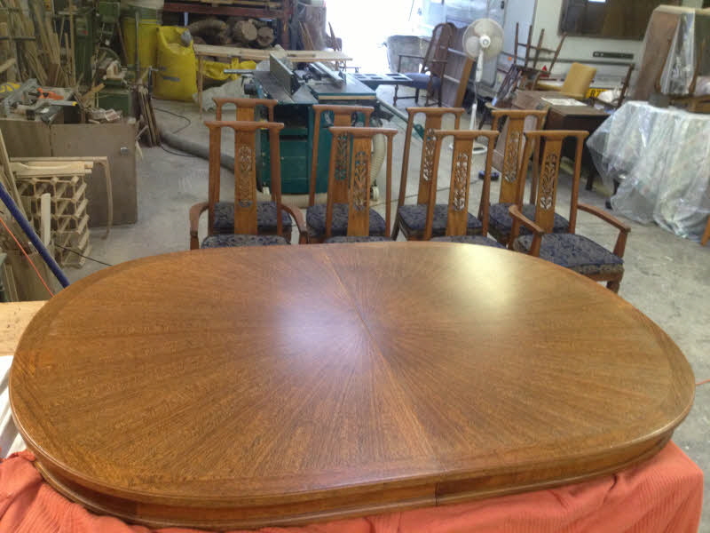 This Teak Dining Set had been stained very dark and there was no depth or lustre to polish. The chairs were all re-glued and I used a satin lacquer to give a natural finish.